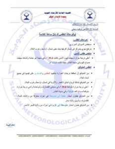 وذكرت هيئة الإرصاد أن أعلى درجة حرارة متوقعة اليوم 39°م في مدينتي القضارف وأبونعامة، وأدنى درجة حرارة متوقعة صباح الغد 13 °م في مدينة الفاشر، وكانت أعلى درجة حرارة سُجلت ليوم أمس 39 °م بمدينة أبونعامة وأدناها 14°سُجلت صباح اليوم بمدينة الفاشر.