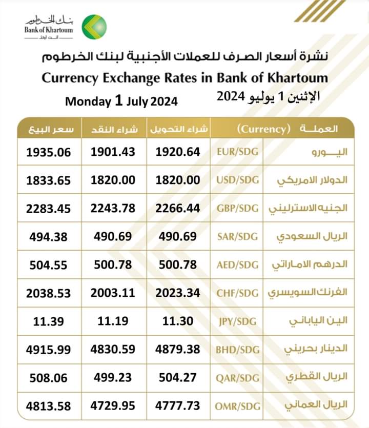 أسعار العملات الأجنبية مقابل الجنية السوداني الصادرة اليوم الأثنين الموافق 1/ يوليو /2024م الصادرة من بنك الخرطوم