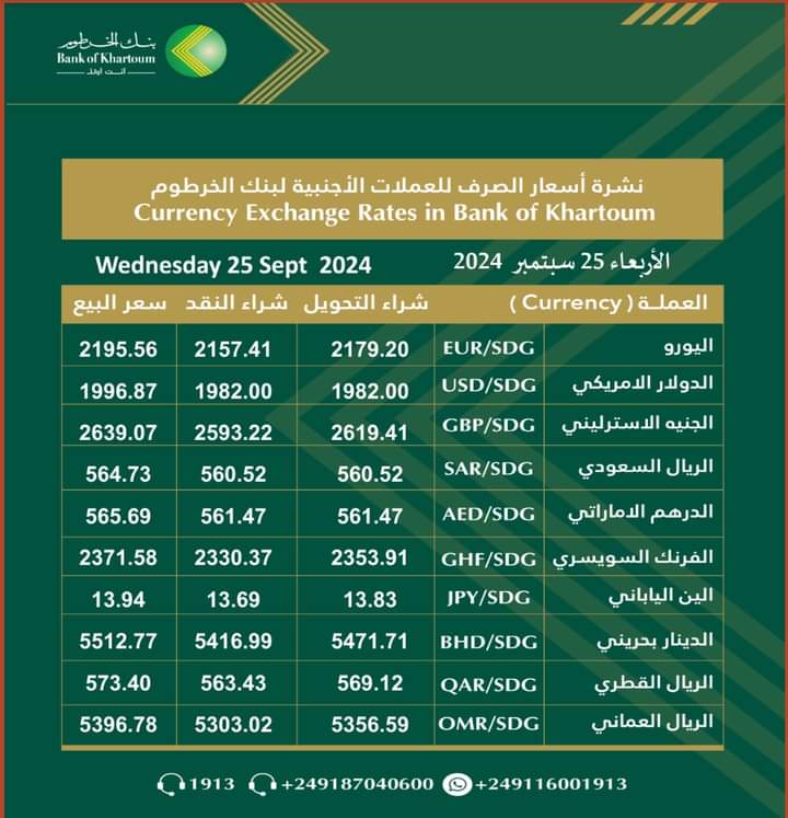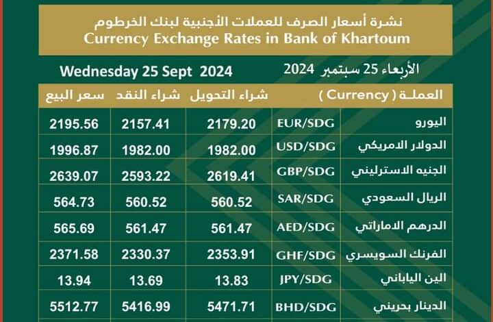أسعار العملات الأجنبية مقابل الجنية السوداني الصادرة اليوم الأربعاء الموافق 25/ سبتمبر /2024م الصادرة من بنك الخرطوم