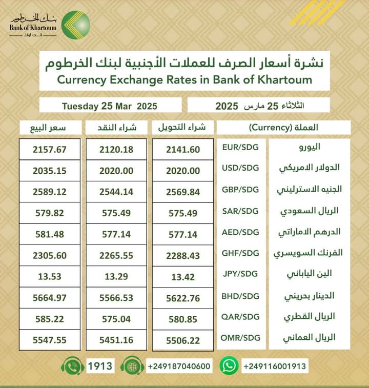 أسعار العملات الأجنبية مقابل الجنية السوداني الصادرة اليوم الثلاثاء الموافق 25/ مارس /2024م الصادرة من بنك الخرطوم