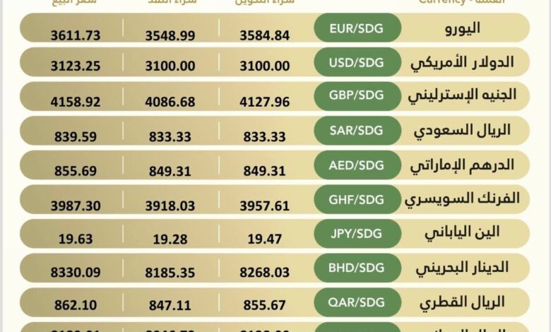| اليورو | EUR/SDG | 3584.84 | 3548.99 | 3611.73 |