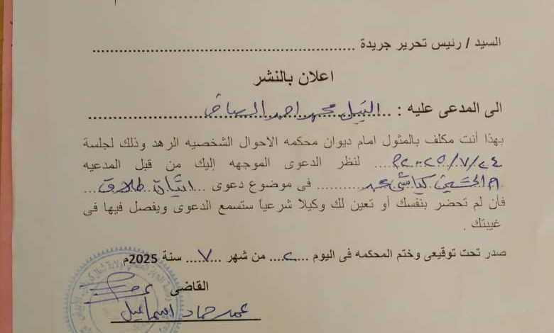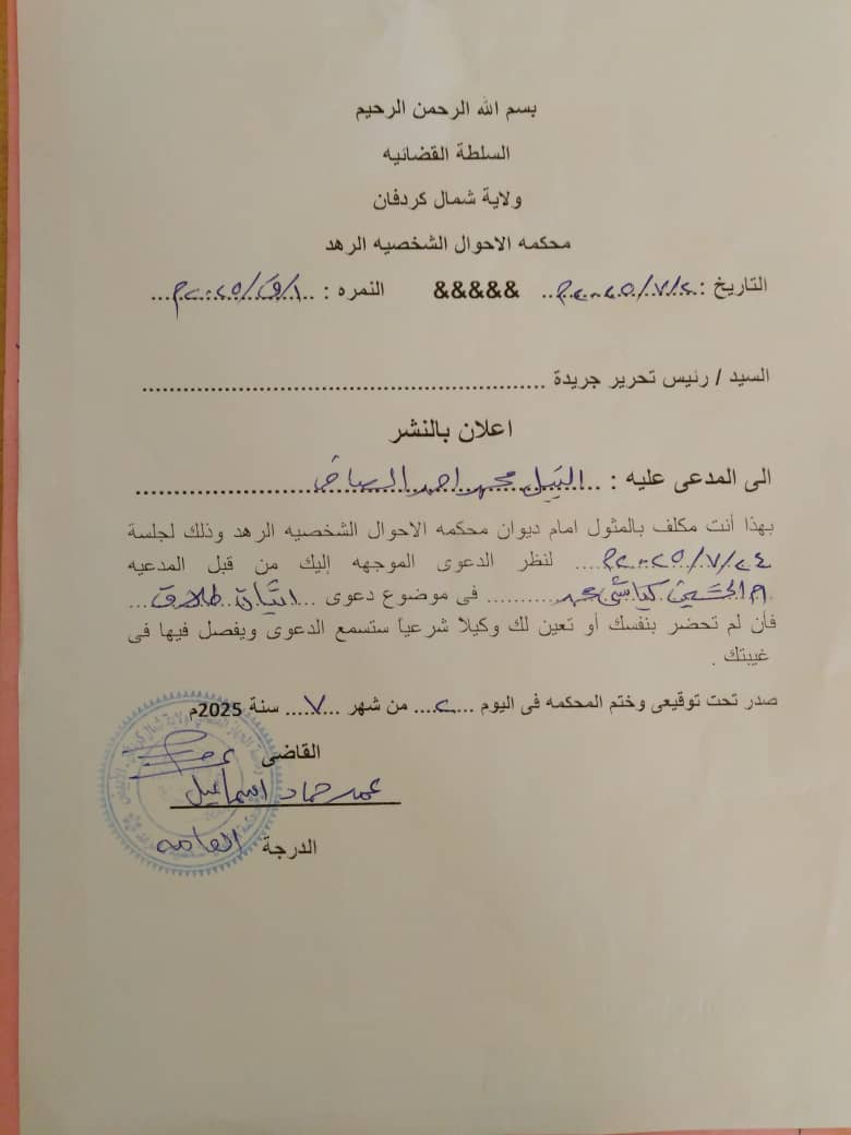 بهذا أنت مكلف بالمثول أمام ديوان محكمة الأحوال الشخصية الرهد وذلك لجلسة 2025/7/24م للنظر في الدعوى الموجهة إليك من قبل المدعية ام الحسين كباشي محمد في موضوع دعوى اثبات طلاق فإن لم تحضر بنفسك أو تعين لك وكيلاً شرعياً ستسمع الدعوى ويفصل فيها في غيبتك.