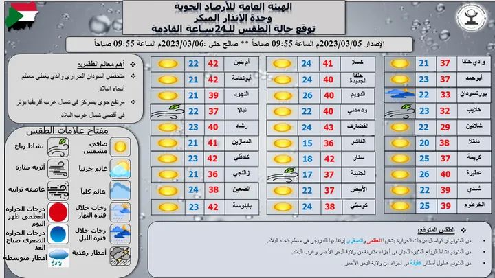 توقعات الهيئة العامة للإرصاد الجوية وحدة الإنذار المبكر لأهم معالم الطقس اليوم منخفض السودان الحراري والذي