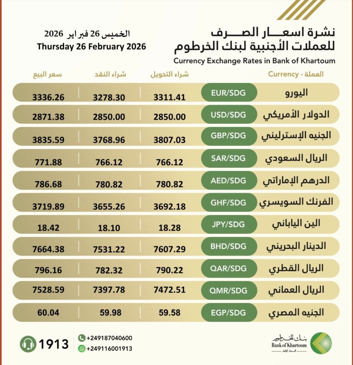 أعلن بنك الخرطوم نشرة أسعار صرف العملات الأجنبية ليوم الخميس 26 فبراير 2026، موضحاً أسعار الشراء (تحويل ونقد) وسعر البيع مقابل الجنيه السوداني، وذلك على النحو التالي: