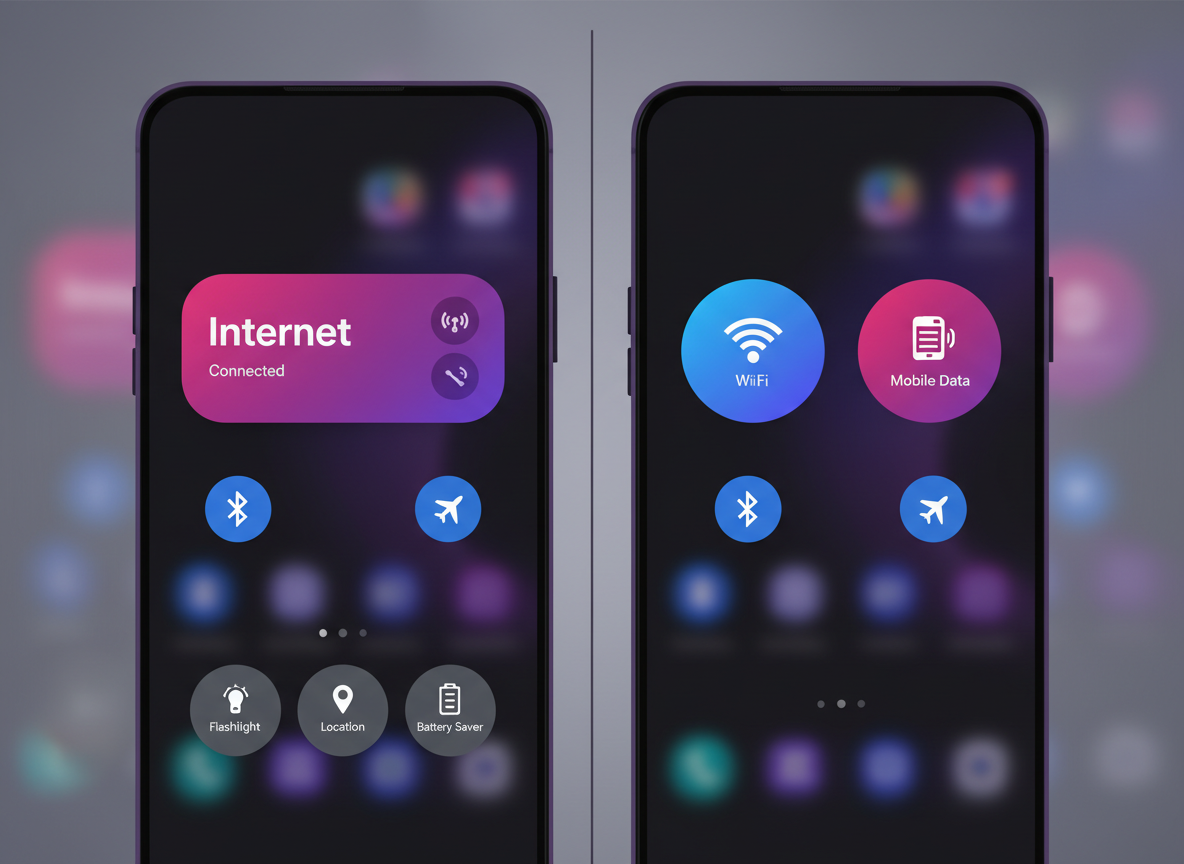 | تبديل الإنترنت | زر موحد (Internet Tile) | أزرار منفصلة (Wi-Fi & Data) |