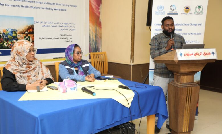 اختتمت إدارة تعزيز الصحة الاتحادية، بالتعاون مع منظمة الصحة العالمية، وبدعم من البنك الدولي (عبر مشروع شير)، اليوم بقاعة فندق سيزون بالخرطوم، ورشة إعداد واجازة حزمة التدريب الوطنية حول تغيير المناخ والمخاطر الصحية، مستهدفة العاملين الصحيين المجتمعيين ومعززي الصحة.