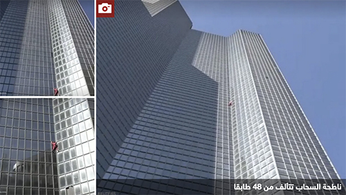 بملابس حمراء، رفع روبرت ذراعيه عاليا عندما وصل إلى قمة مبنى تور توتال إنرجيز الذي يبلغ ارتفاعه 187 مترا في حي الأعمال لا ديفونس بالعاصمة الفرنسية.