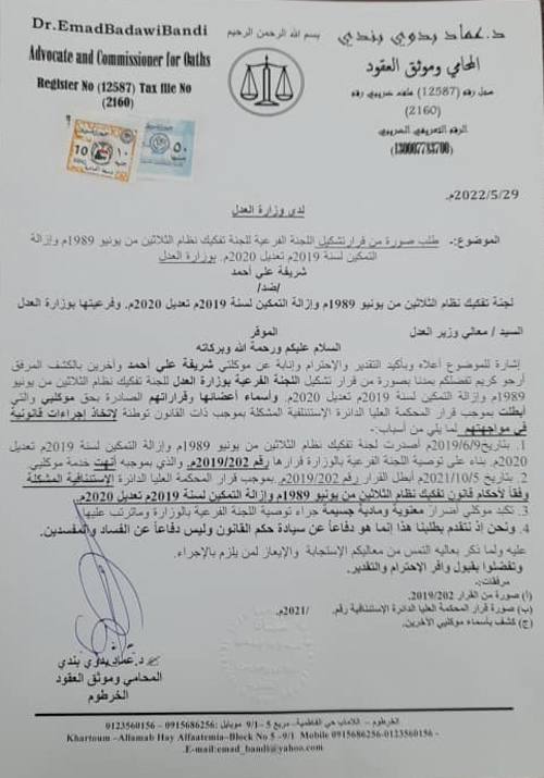 اودع المستشارين القانونين المشمولين بقرار لجنة ازالة التمكين، الذين تمت اعادتهم بقرارات المحكمة العليا، اودعوا طلب للسيد وزير العدل بغرض مدهم باسماء اعضاء اللجنة الفرعية للجنة ازالة التمكين بوزارة العدل بغية تقييد دعاوي ضدهم في المحاكم، وذلك لاشانة سمعتهم والافتراء عليهم بالكذب وتسببوا في فصلهم من العمل.