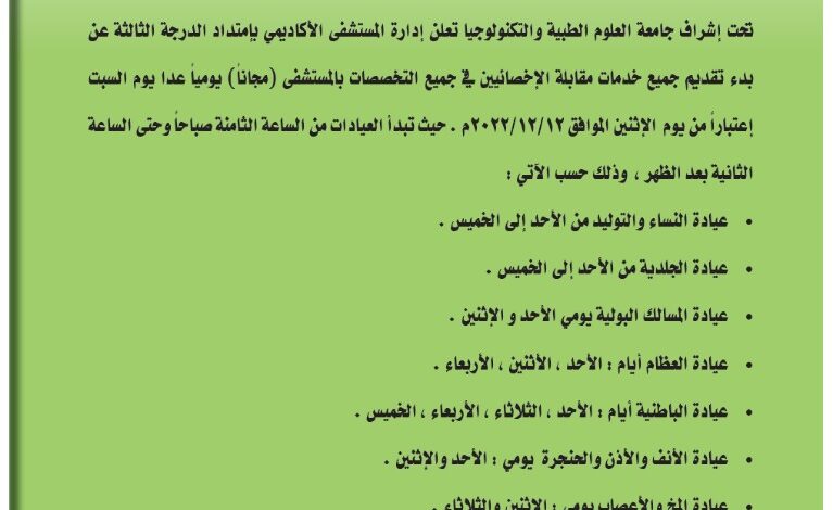 من ” عيادات النساء والتوليد والجلدية من الأحد للخميس، وعيادة المسالك البولية يومي الأحد والاثنين، وعيادة العظام ايام الأحد، الاثنين، الأربعاء ، وعيادة الباطنية ايام الأحد، الثلاثاء، الأربعاء والخميس، عيادة الأنف والأذن والحنجرة يومي الأحد