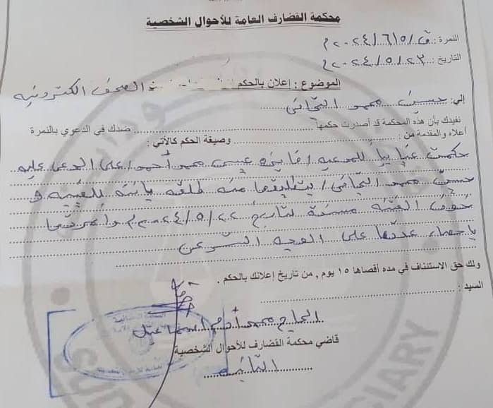 نفيدك بان هذه المحكمة قد اصدرت حكمها ضدك كالأتي:_