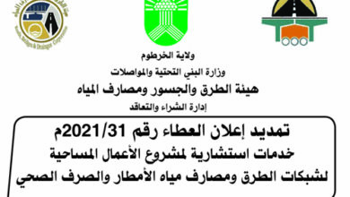 ولاية الخرطوم وزارة البنى التحتية والمواصلات هيئة الطرق والجسور ومصارف المياه إعلان عطاء رقم (5) للعام 2026م عبارات وحماية حجرية بشارع الريف الجنوبي أمدرمان