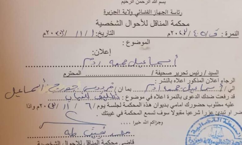 محكمة المناقل للأحوال الشخصية..إعلان..