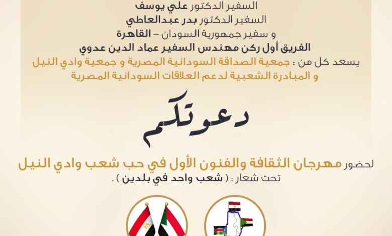 واضاف يأتي هذا الحدث الثقافي والفني بتنظيم مشترك من جمعية الصداقة السودانية المصرية وجمعية وادي النيل والمبادرة الشعبية لدعم العلاقات السودانية المصرية، تعبيرًا عن عمق الروابط التاريخية والثقافية بين الشعبين الشقيقين.