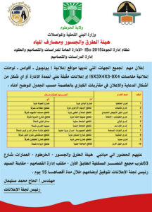 هيئة الطرق والجسور ومصارف المياه إعلان مهم لجميع الجهات التي لديها مواقع إعلانية