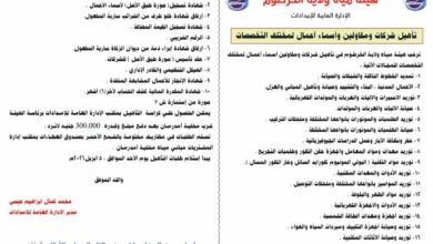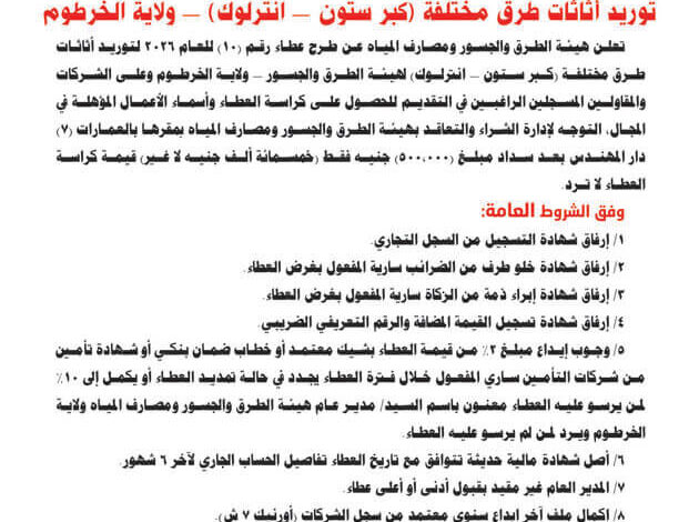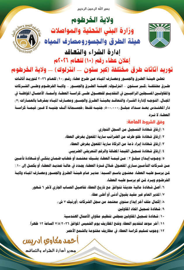 تعلن هيئة الطرق والجسور ومصارف المياه عن طرح عطاء رقم (10) للعام 2026 لتوريد أثاثات طرق مختلفة (كبر ستون — انترلوك) لهيئة الطرق والجسور — ولاية الخرطوم وعلى الشركات والمقاولين المسجلين الراغبين في التقديم للحصول على كراسة العطاء وأسماء الأعمال المؤهلة في المجال، التوجه لإدارة الشراء والتعاقد بهيئة الطرق والجسور ومصارف المياه بمقرها بالعمارات (7) دار المهندس بعد سداد مبلغ (500,000) جنيه فقط (خمسمائة ألف جنيه لا غير) قيمة كراسة العطاء لا ترد.