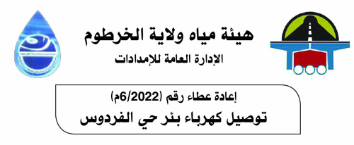 هيئة مياه ولاية الخرطوم..إعادة عطاء رقم (6/2022م)توصيل كهرباء بئر حي الفردوس