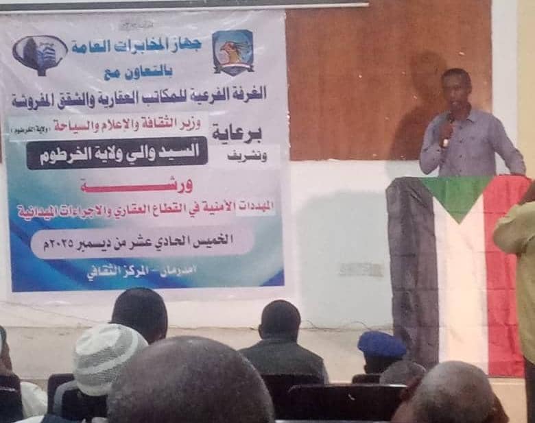 نظّم جهاز المخابرات العامة بالتعاون مع الغرفة الفرعية للمكاتب العقارية والشقق المفروشة، ورشة عمل بعنوان “المهددات الأمنية في القطاع العقاري والإجراءات الميدانية”، وذلك برعاية وزير الثقافة والإعلام والسياحة بولاية الخرطوم، اليوم 11 ديسمبر 2025م، بالمركز الثقافي بأمدرمان.
