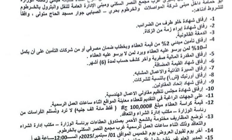 ولاية الخرطوم وزارة البنى التحتية والمواصلات..إدارة الشراء والتعاقد والاصول .. إعلان عطاء صيانة مباني رئاسة الوزارة بالخرطوم