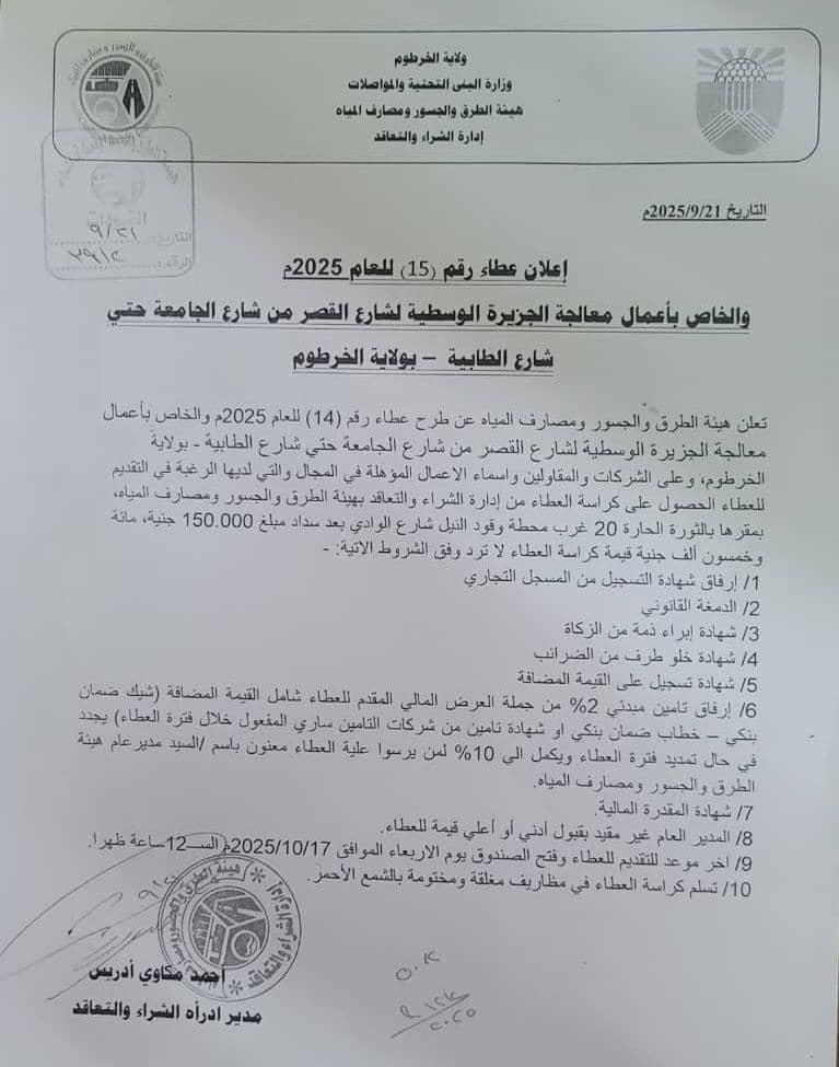ولاية الخرطوم وزارة البنى التحتية والمواصلات هيئة الطرق والجسور ومصارف المياه إدارة الشراء والتعاقد إعلان عطاء رقم (15) للعام 2025م والخاص بأعمال معالجة الجزيرة الوسطية لشارع القصر من شارع الجامعة حتي شارع الطابية – بولاية الخرطوم