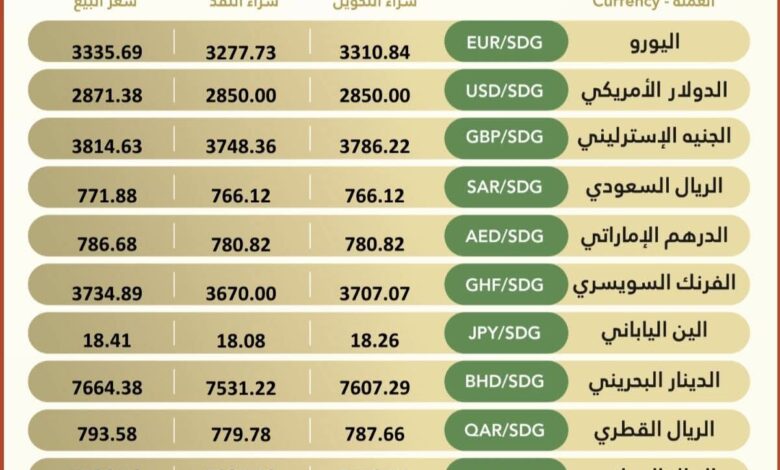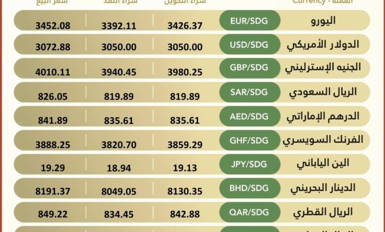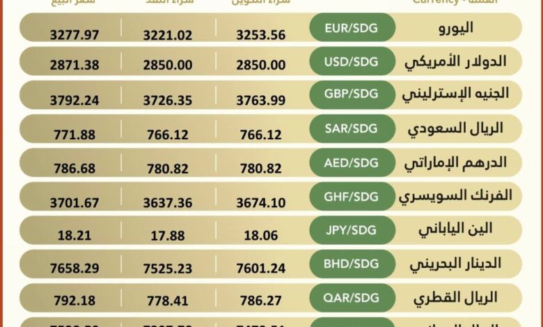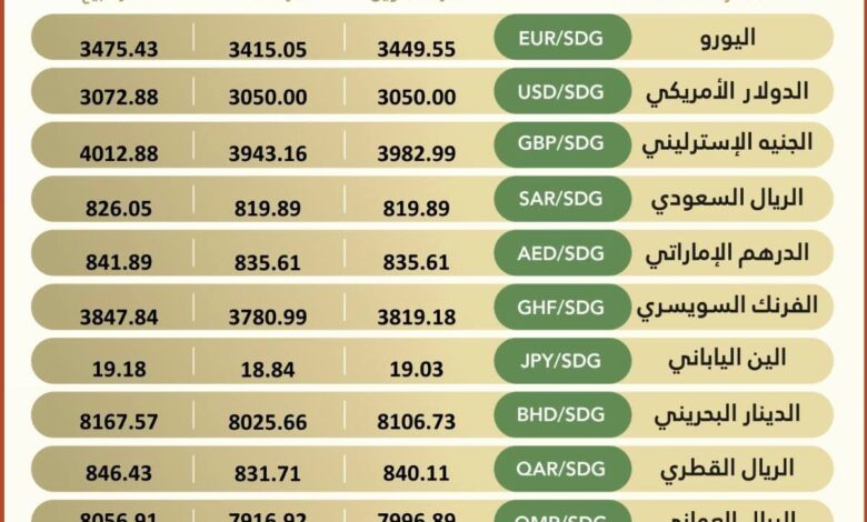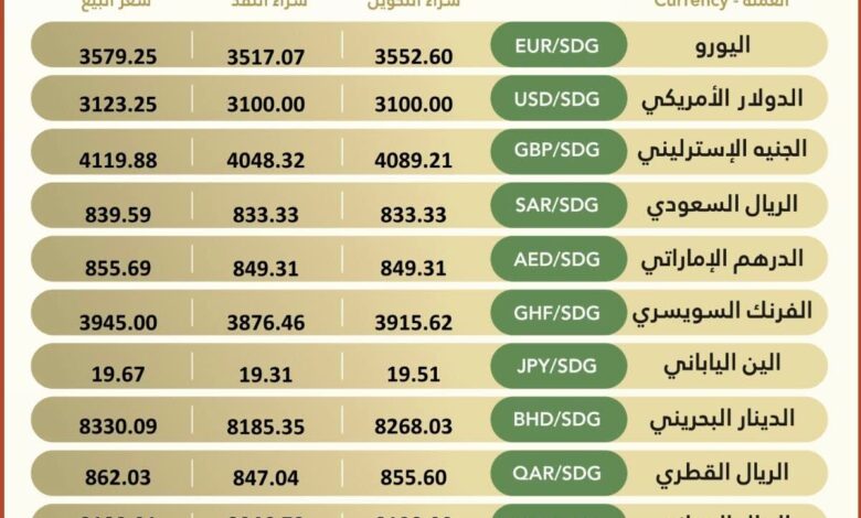أسعار صرف العملات الأجنبية – بنك الخرطوم العملة الرمز شراء التحويل شراء النقد سعر البيع اليورو EUR/SDG 3584.84…