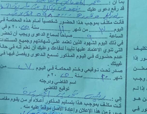 فأنت مكلف بموجب هذا الحضور شخصياً أمام هذه المحكمه في اليوم ٣/١١/2025 م الساعه ٩صباحا لسماع الدعوى ويجب أن تحضر…