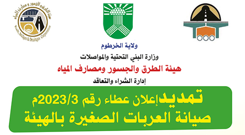 هيئة الطرق والجسور ومصارف المياه تمديدإعلان عطاء رقم 3/2023م صيانة العربات الصغيرة بالهيئة ولاية الخرطوم وزارة البني التحتية والمواصلات هيئة…