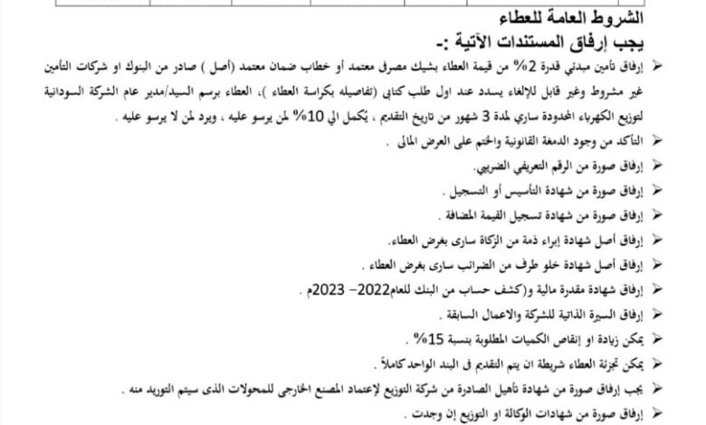 الشركة السودانية لتوزيع الكهرباء المحدودة إعلان عطاء عام