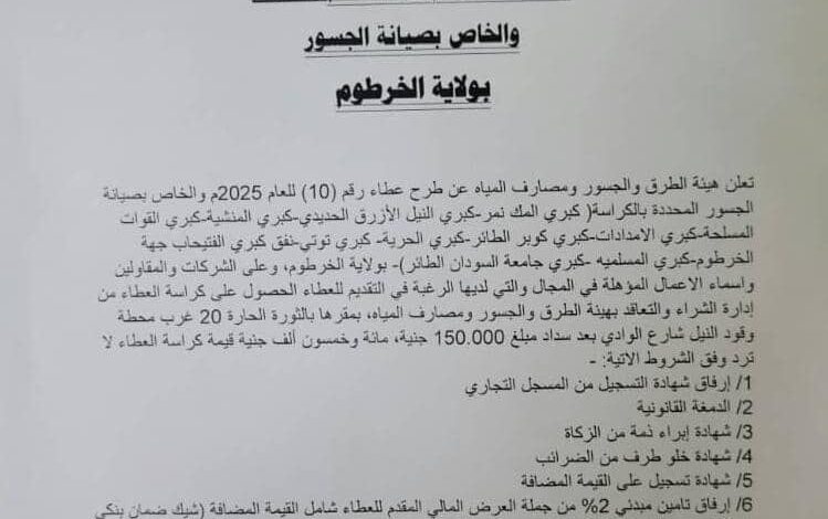 تعلن هيئة الطرق والجسور ومصارف المياه عن طرح عطاء رقم (10) للعام 2025م والخاص بصيانة الجسور المحددة بالكراسة ) كبري…